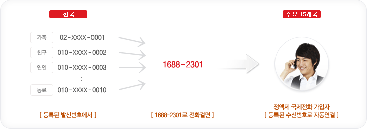 예) 010-123-4567 한국전화번호에서 1688-2301로 통화하면 등록한 수신번호로 바로 전화연결 됩니다.