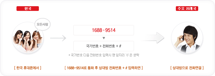 예) 한국에서 1688-9514로 전화하면 음성멘트가 나오며, ‘상대방 전화번호+#’을 입력하면 바로 전화연결 됩니다.